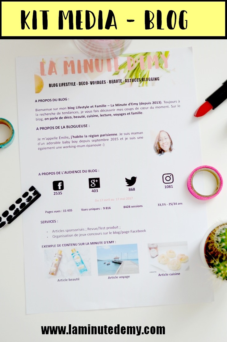 Un kit media donne des informations et des statistiques sur votre blog. Très concrètement, les marques intéressées par votre blog peuvent vous demander un certain nombre d’informations sur le contenu que vous proposez. Ce document doit contenir un aperçu des sujets que vous abordez, une petite biographie de vous et des informations clés sur votre lectorat : nombre de visiteurs uniques, nombre de pages vues mensuelles, services proposés, etc.